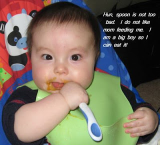 It was a long journey for me and Little H. Finally, today, he decided that he try to eat from a spoon. Well, I have to tell you he still does not like me feeding him. So he took the spoon to himself and he put it in his mouth.